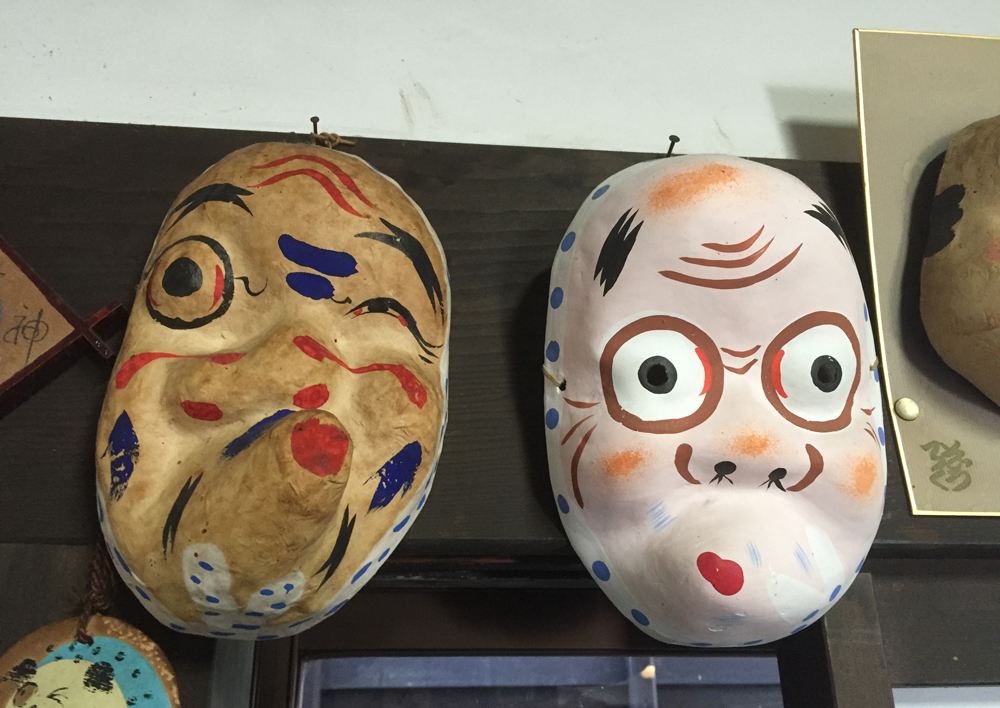 店内には、ひょっとこのお面がずらり。店主さんが、全国を旅行して集めたお面だそう!