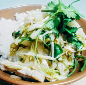 【農家のレシピ】パクチーと酢玉ねぎと豚肉の丼