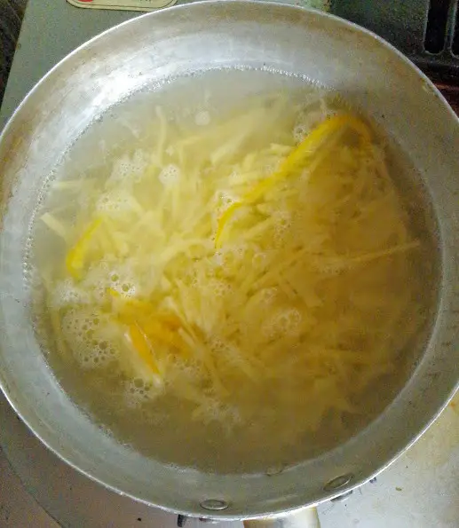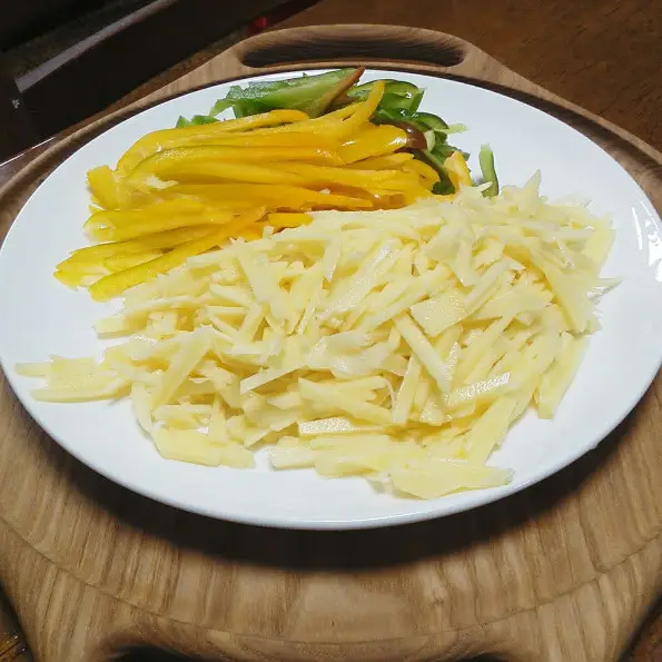 パプリカとじゃがいもは千切りに。にんにくはみじん切りにする。