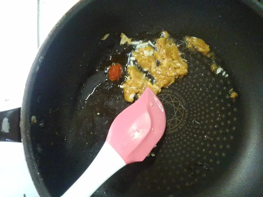 4.豆板醤、味噌を入れて炒め、香りを出す。なじんだらしょうゆと酒を加えてのばす。