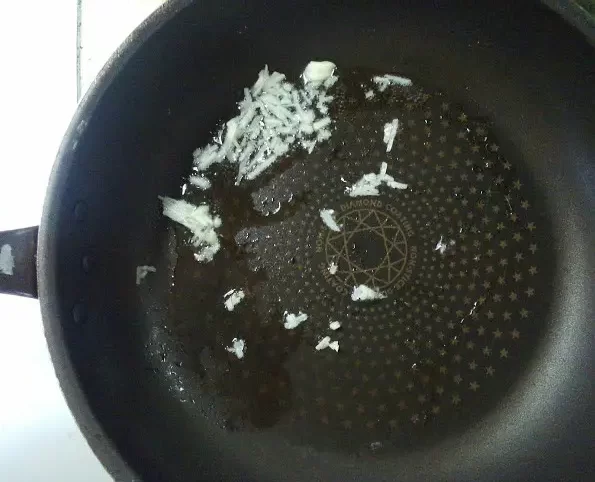 3.【調理】フライパンに油とニンニクを入れ、弱火で炒める。